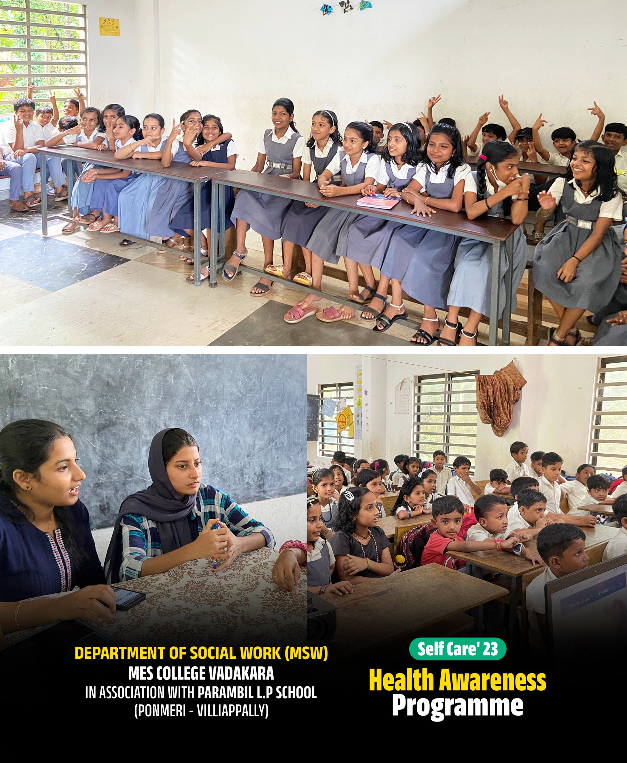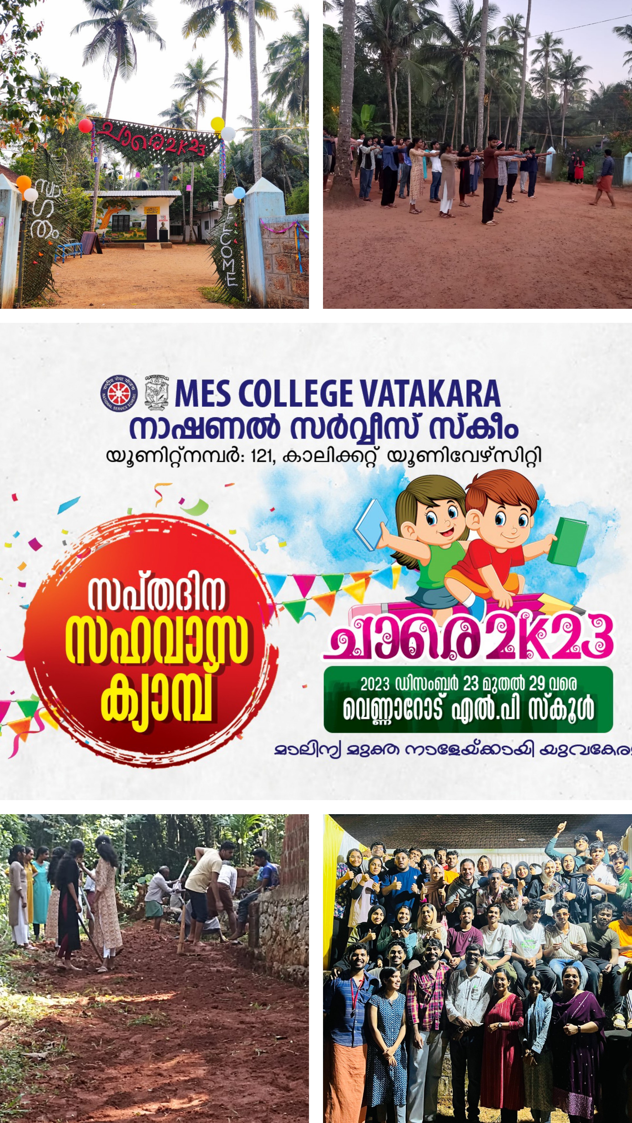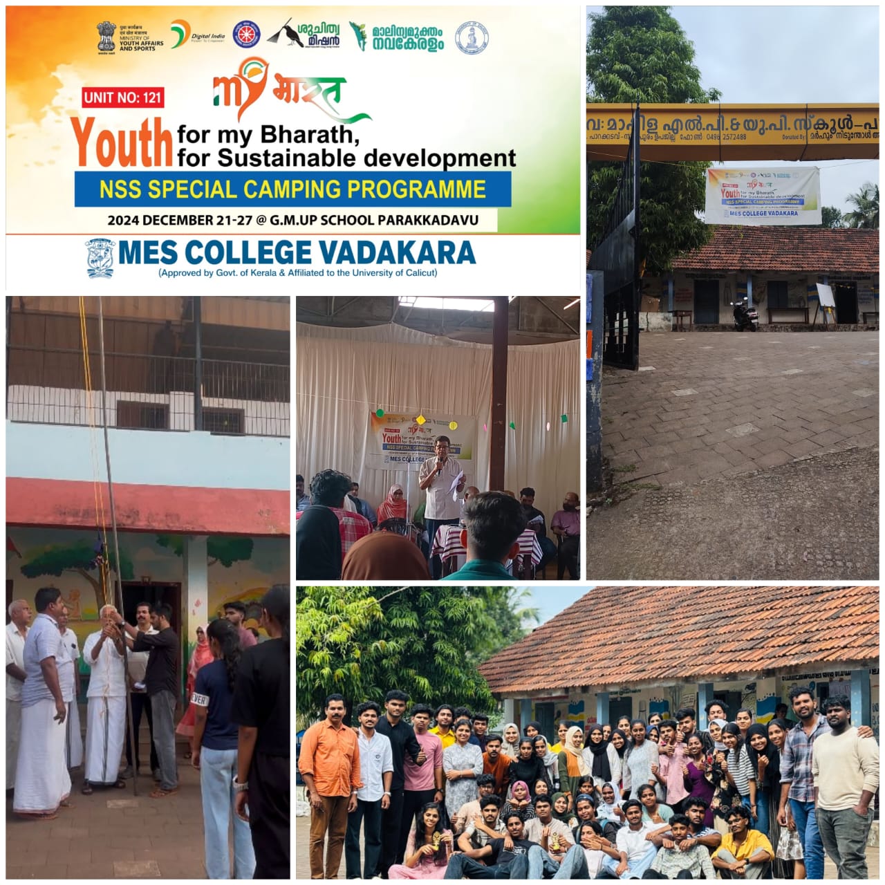 The NSS unit of MES College Vatakara organized seven day camps community living camp at GMUP School parakkadav. Total 42 students registered NSS Volunteers participated in the camp. NSS unit in our college established in our college with an aim of establishing sense of social responsibility amongst UG students. It also aimed at the inculcating nature of self-discipline and selfless dedication towards community development.