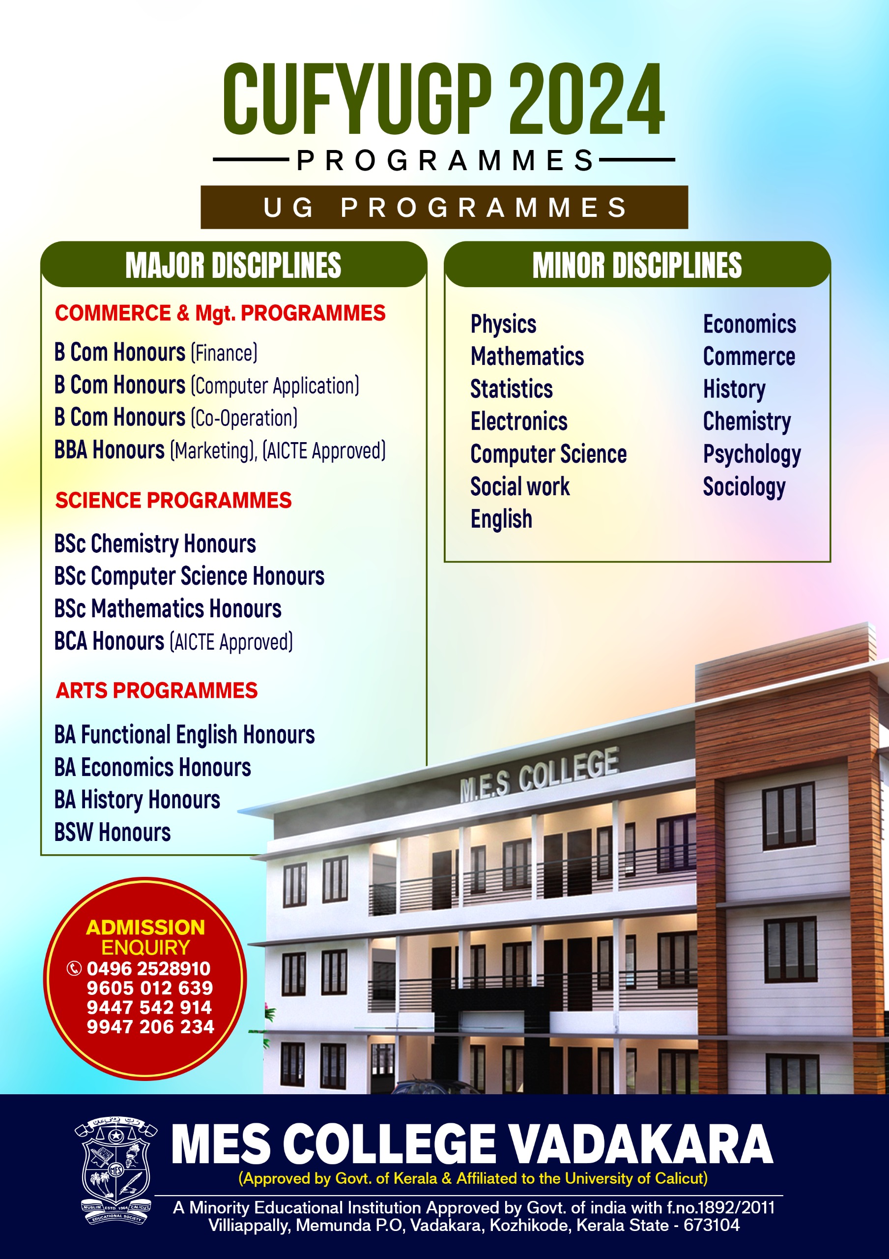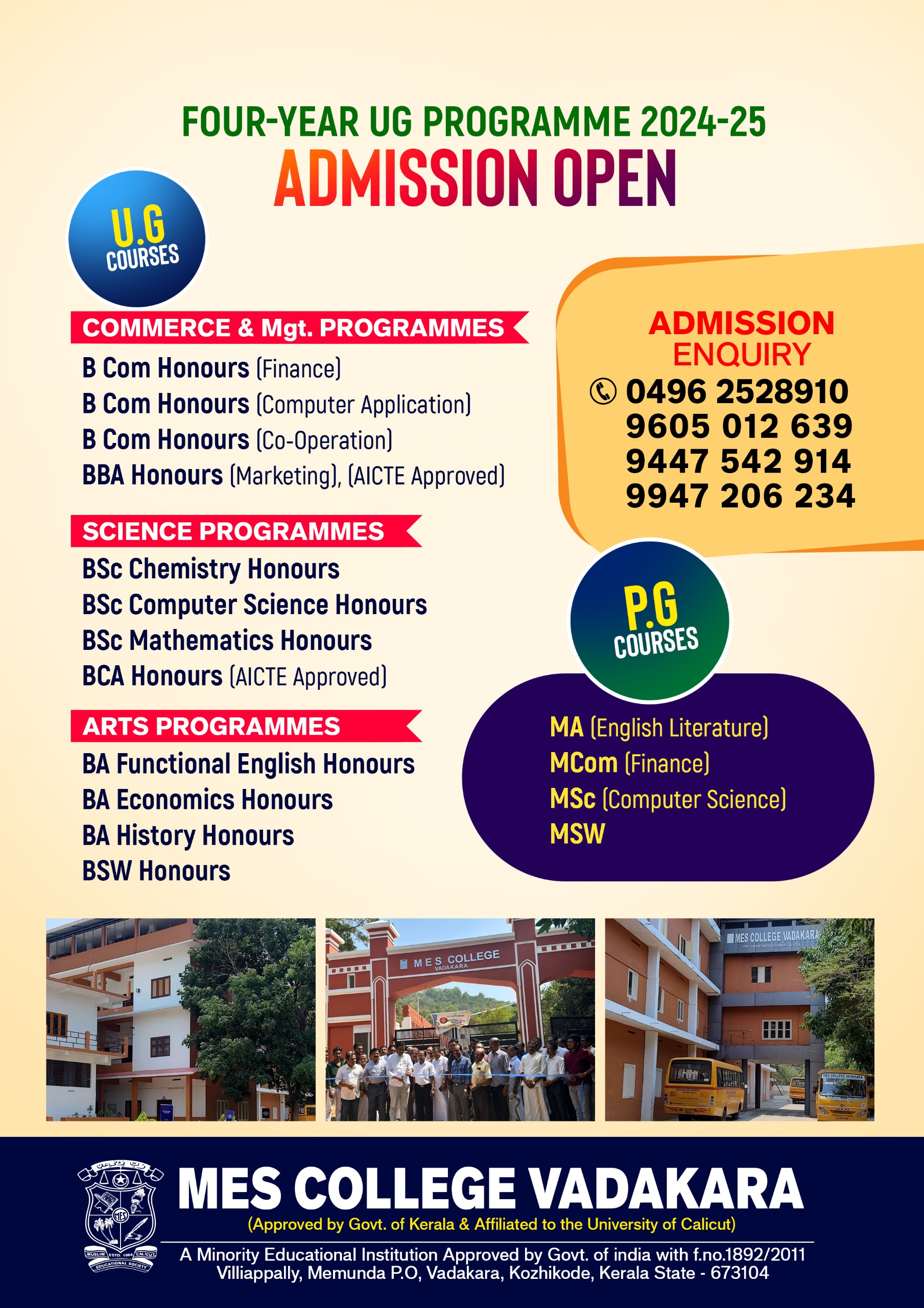 "Vijnanaolsavam - Four-year undergraduate program inaugurated at MES College of Arts and Science. The program aims to provide international standard education, student-centric learning, and skill development. The inauguration ceremony was held on July 1, 2024, at 12:00 AM